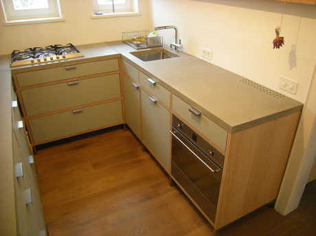 MIT DEN GESCHLIFFENEN UND GEÖLTEN ARBEITSPLATTEN AUS HOCHFESTEM, SELBSTVERDICHTENDEM BETON, DIE SPÜLE ALS UNTERBAUELEMENT AUSGEFÜHRT, DIE FRONTEN DER SCHÜBE UND TÜREN AUS 12MM-ETERNIT-FASSADENPLATTEN GEFERTIGT, FLÄCHENBÜNDIG INTEGRIERT IN 26MM STARKE EICHENKORPUSSE, HAT DIESE KÜCHE NICHT DAS HERKÖMMLICHE ERSCHEINUNGSBILD EINER EINBAUKÜCHE, SONDERN DAS EINES INDIVIDUELL GEPLANTEN UND GEFERTIGTEN MÖBELSTÜCKES.