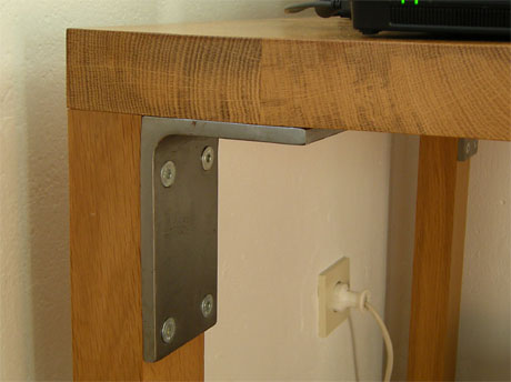 ODER DIE SICHTBAREN BALKEN DER HOLZBALKENDECKE WERDEN ZUR AUFHÄNGUNG EINES REGALS AUS GEWINDESTANGEN UND EDELSTAHLBLECH GENUTZT.